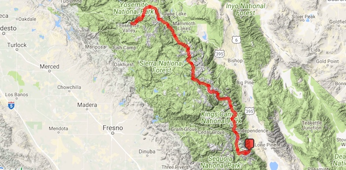 220 mile Whitney Portal to Yosemite Happy Isles hiking route